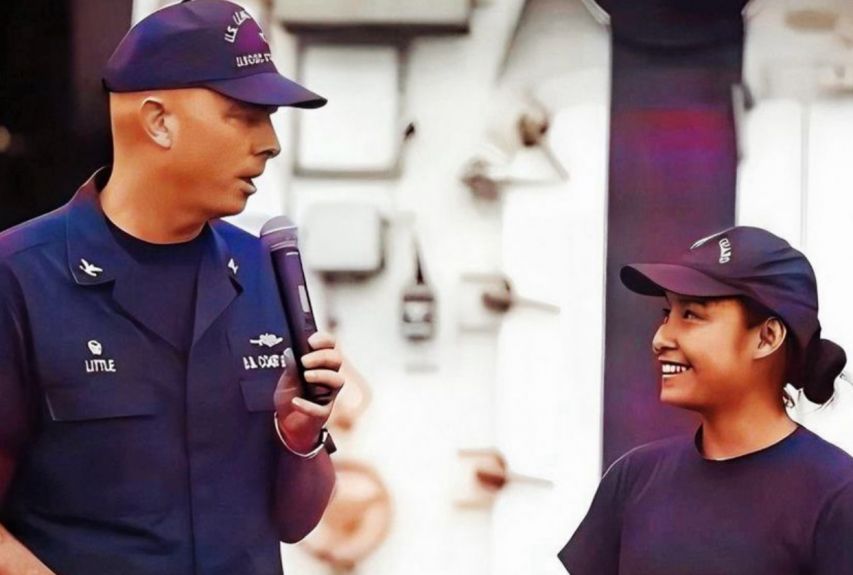 【曾站在美軍艦上用中文警告我海警船的鄭浩兒,站在美軍艦上和中國海警船合影】